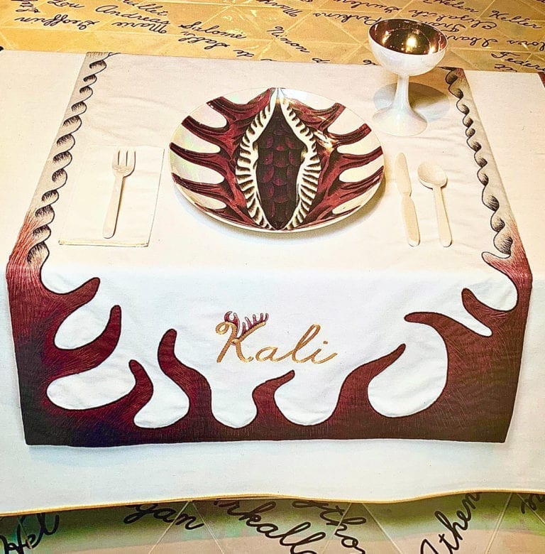 The dinner party needlework together with the dinner party poster for the exhibition at the brooklyn museum.